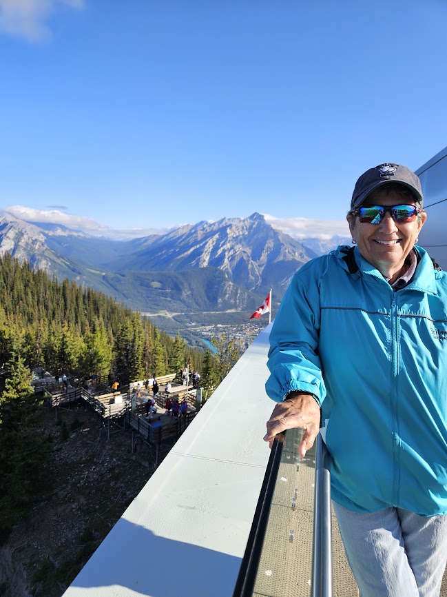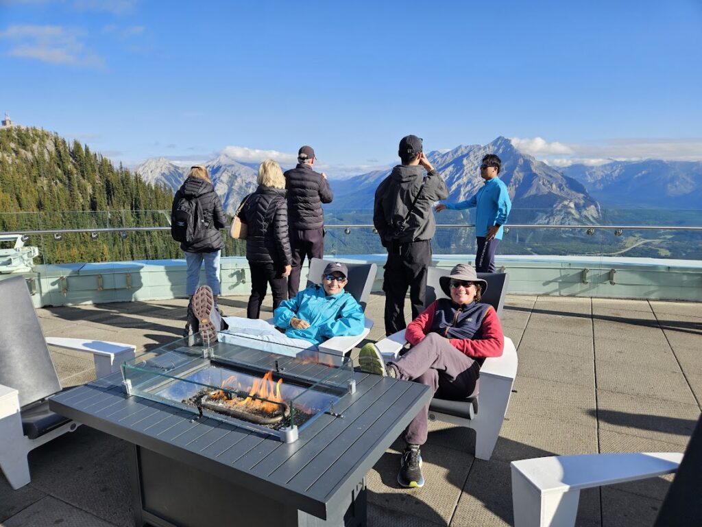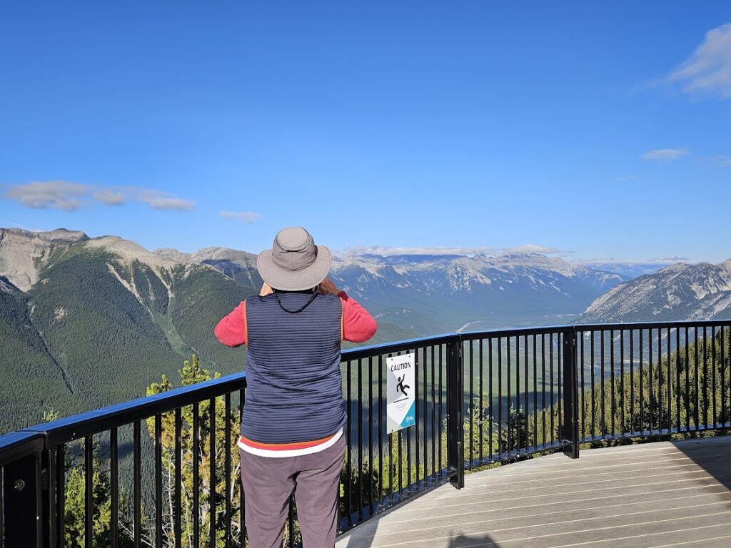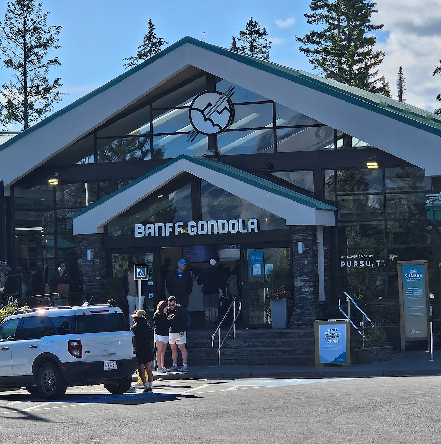 We met the tour bus in front of the train station. If you want free parking in Banff, the train station is the place to go. Yesterday we had a small group tour in a van. Today we are on a bus. It isn’t full so there’s plenty of room to spread out and we have great seats up front. Our first stop was the famous Banff Gondola Ride.
