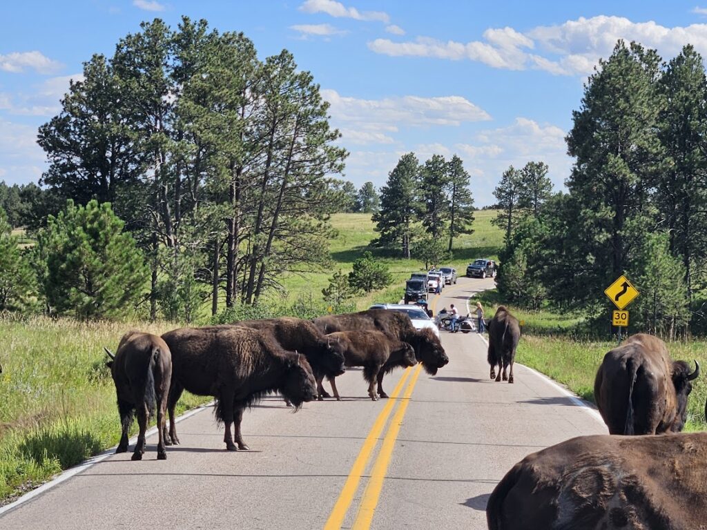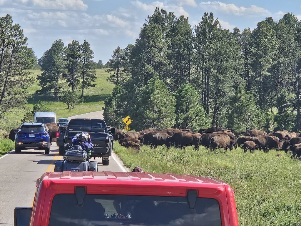 There were 100’s of buffalo or bison not sure, on both sides of the street, in the street and up close and personal. As I sat in the passenger seat with the window down waiting for the thundering herd (not thundering really, sauntering, sunbathing, relaxing, protesting cars) to clear a small path for us, in the corner of my eye I saw something. To this point, all the buffalo were in front of us. However, I turned my head to the right to look out my side window and two buffalo were standing right beside me. Oh Sh__!!! Up went the window.