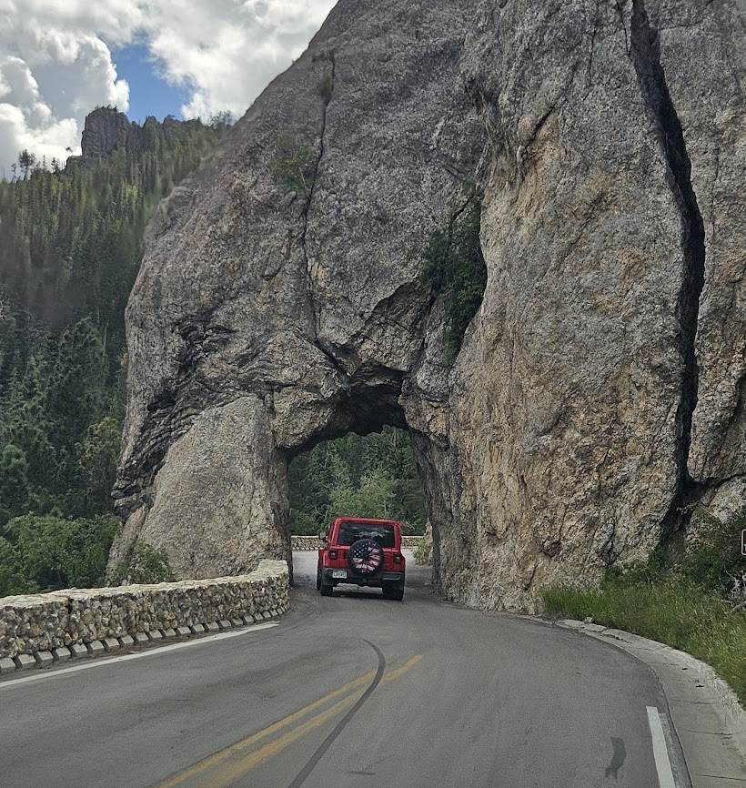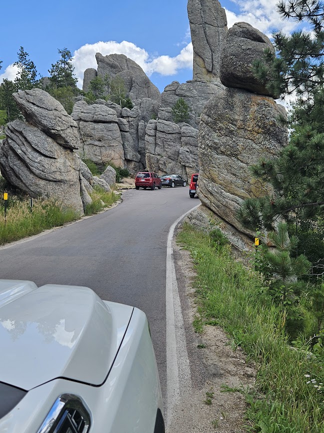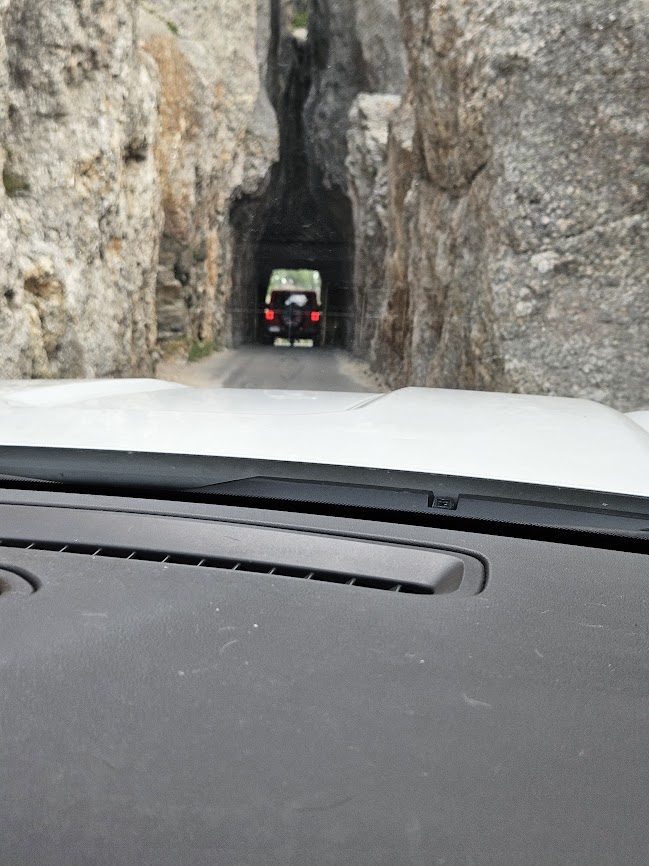 Welcome to Needles Road in the famous Custer State Park. It’s called Needles because… no idea really. Maybe it’s the small eye of the needle tunnels we are destined to pass through. Switchbacks and three tunnels make this road a destination. Above you see Dave and Susie’s jeep going through the first tunnel. We are next. Wait until you see the next two. Because the road is curvy, narrow and edges along the side of a mountain, Needles Road is a fun adventure for motorcyclists.