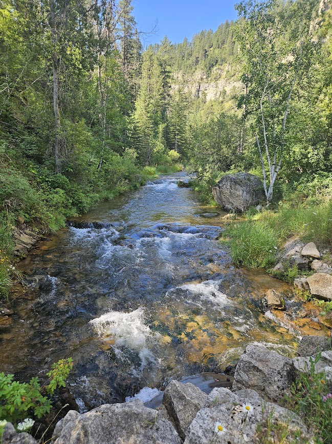 I love watching the water run briskly over the rocks on the mountainside. It is one of my favorite ways to relax. I could easily sit on one of those rocks all day and enjoy the serenity and sounds of the mountain stream or in this case the Spearfish River. Pam, pick me up later.